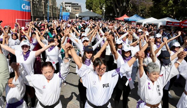 CIUDAD DE PUEBLA, Pue.-Como parte de una iniciativa que fortalece la seguridad, la confianza y la organización comunitaria de las participantes, cientos de poblanas participaron en una clase masiva de karate do, enfocada en la defensa personal, organizada por el Gobierno del Estado en el marco del Día Internacional de la Mujer.