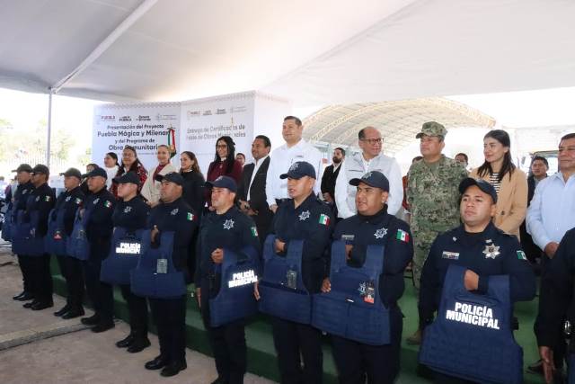 El mandatario informó que se reforzarán 30 módulos de seguridad en las entradas colindantes con 7 estados, además encabezó la entrega de 40 chalecos antibalas para la policía municipal, 20 motopatrullas y la presentación de 35 elementos de la guardia civil y turística del municipio, quienes realizarán tareas de vigilancia, serán un vínculo de fortalecimiento del tejido social y un puente de comunicación y colaboración con la sociedad.