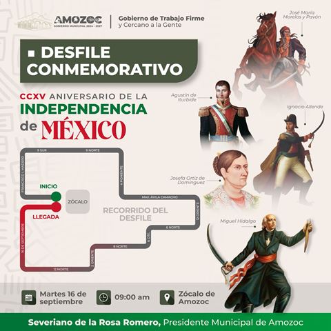 El Gobierno Municipal de Amozoc, que encabeza Severiano de la Rosa Romero, invita al Desfile Cívico Conmemorativo del CCXV Aniversario del Inicio de la Lucha por la Independencia de México, con el propósito de rendir homenaje a los héroes que nos dieron patria y libertad.