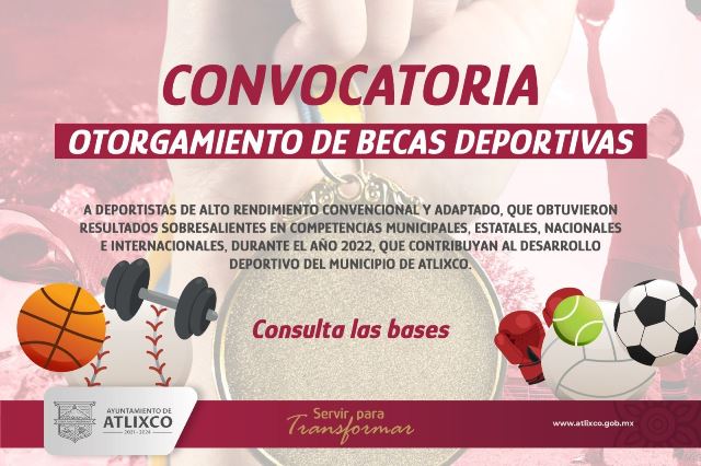 A fin de seguir impulsando la línea estratégica transversal de alejar a las y los jóvenes de vicios, así como malos hábitos, a través del deporte, el Ayuntamiento de Atlixco encabezado por Ariadna Ayala concederá 10 becas a atletas de alto rendimiento convencional y adaptado, que han obtenido resultados destacados mediante el “Programa de Otorgamiento de Becas Deportivas 2023”.