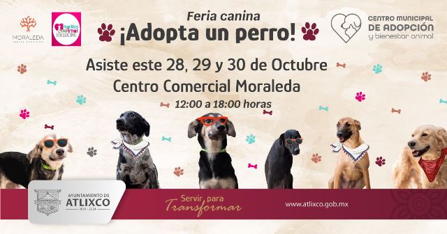 Continuando con el compromiso de promover el bienestar animal y disminuir la sobrepoblación de animalitos que se encuentran en condición de calle por abandono, la presidenta municipal de Atlixco, a través del Centro Municipal de Adopción y Bienestar Animal, se suma a la primera edición de la Mini Feria de Adopción Canina, la cual se llevará a cabo del 28 al 30 de octubre en Plaza Moraleda.