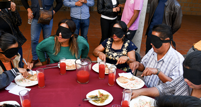 Durante la concientización La Merienda a Ciegas, a los asistentes les fueron vendados los ojos, para experimentar lo que una persona invidente tiene que realizar a la hora de actos tan cotidianos como comer y beber, el objetivo es comer sin ver nada y experimentar lo que se siente, cuando padeces una discapacidad visual, mencionó Rutilo Michimani.
