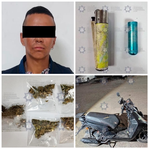 Cuautlancingo, Pue.- La Secretaría de Seguridad Ciudadana y Protección Civil del municipio de Cuautlancingo informa que, como resultado de los recorridos permanentes de seguridad y vigilancia, se logró la detención de un masculino por su probable responsabilidad en delitos contra la salud, así como el aseguramiento de una motocicleta con reporte de robo.