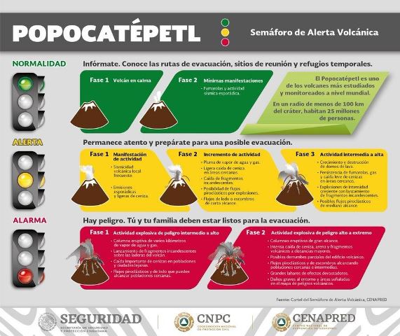 De acuerdo con el último análisis de la mesa de expertos del CENAPRED, el semáforo de alerta volcánica se eleva a amarillo fase 3, esto implica mayor destrucción de domos de lava, caída de ceniza de leve a moderada en poblaciones cercanas, explosiones de intensidad creciente con fragmentos incandescentes, esta fase no contempla la evacuación de comunidades cercanas.