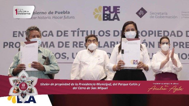 Otras de las acciones importantes con el Gobierno del Estado que mencionó la alcaldesa, fue la regularización de 73 expedientes de particulares, así como 27 expedientes de bienes de servicios públicos y la regularización a través del programa de regularización de predios rústicos urbanos y suburbano en el régimen de propiedad privada para el estado de Puebla, y por primera vez en la historia del municipio, la obtención de los títulos de propiedad de la Presidencia Municipal, del Parque Colón y del Cerro de San Miguel.