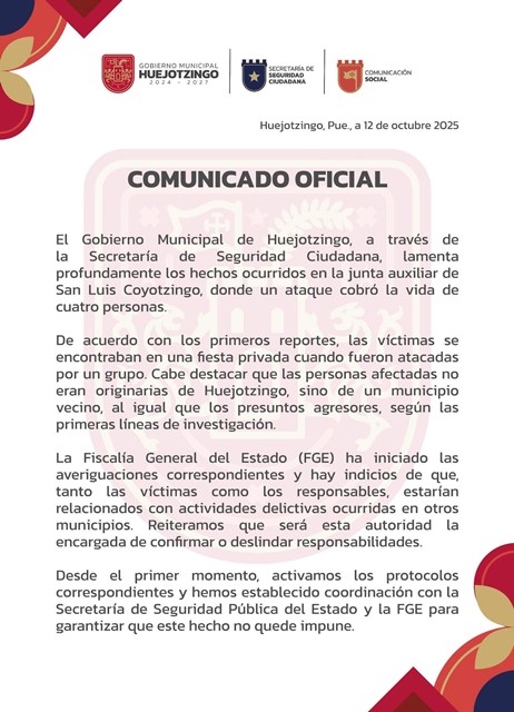 El Gobierno Municipal de Huejotzingo lamentó profundamente el ataque ocurrido en la junta auxiliar de San Luis Coyotzingo, donde cuatro personas perdieron la vida en una fiesta privada.