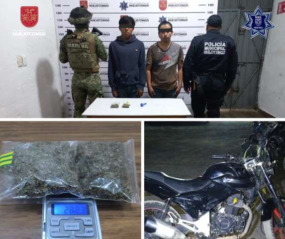 A estos sujetos se les aseguraron 11.26 gramos de cristal y 28.83 gramos de marihuana, además de una motocicleta Italika Forza, modelo 2019, con reporte de robo vigente.