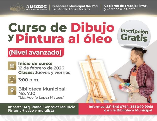 El curso dará inicio el 12 de febrero de 2026 y se impartirá los días jueves y viernes a las 3:00 de la tarde, en la Biblioteca Municipal No. 730 “Lic. Adolfo López Mateos”. La capacitación estará a cargo del Arq. Rafael González Mauricio, pintor artístico y muralista, quien compartirá sus conocimientos y experiencia con las y los participantes.