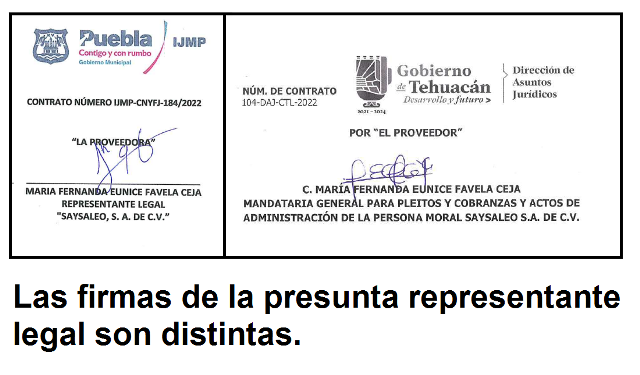 Saysaleo S.A. de C.V., ubicada en un edificio de departamentos, sin instalaciones fabriles o comerciales, Representada por María Fernanda Eunice Favela Ceja en el contrato suscrito con el Instituto de la Juventud del municipio de Puebla (IJMP) representado en ese acto por Karla Adriana Martínez Lechuga y el de Tehuacán con el presidente municipal, Pedro Tepole Hernández,   entre otros funcionarios.