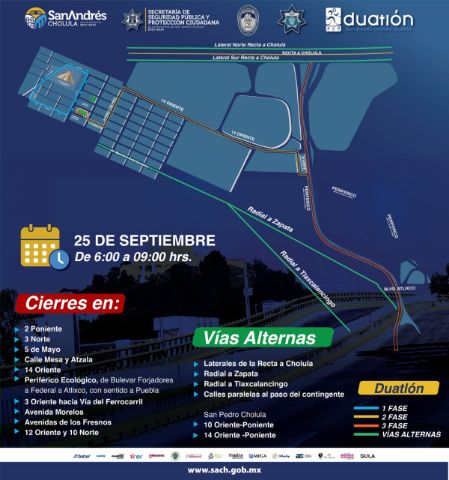 San Andrés Cholula, Puebla. – Ante el desarrollo del Duatlón a realizarse el próximo domingo 25 de septiembre, la Secretaría de Seguridad Pública y Protección Ciudadana de San Andrés Cholula, informa sobre los cierres a la circulación y vías alternas que se implementarán a partir de las 6:00 hasta las 09:00 horas.