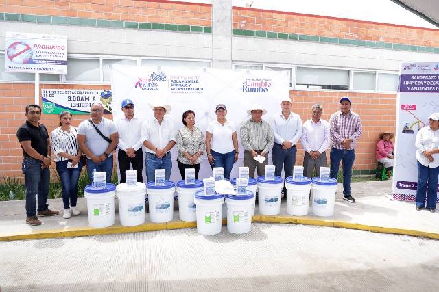 Durante el evento también se entregaron cubetas de pastillas de hipoclorito de calcio a representantes de las juntas auxiliares y colonias del municipio como medida complementaría para el saneamiento del agua.