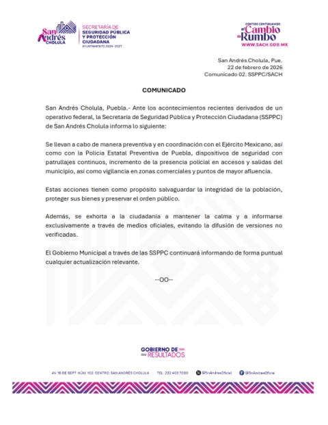 La Secretaría de Seguridad Pública y Protección Ciudadana de San Andrés Cholula informó que, ante los acontecimientos recientes derivados de un operativo federal, se han implementado acciones preventivas para garantizar la seguridad en el municipio.