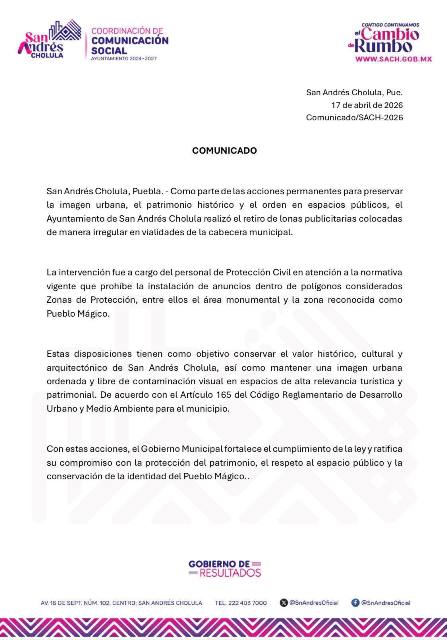San Andrés Cholula, Puebla. – Como parte de las acciones permanentes para preservar la imagen urbana, el patrimonio histórico y el orden en espacios públicos, el Ayuntamiento de San Andrés Cholula realizó el retiro de lonas publicitarias colocadas de manera irregular en vialidades de la cabecera municipal.