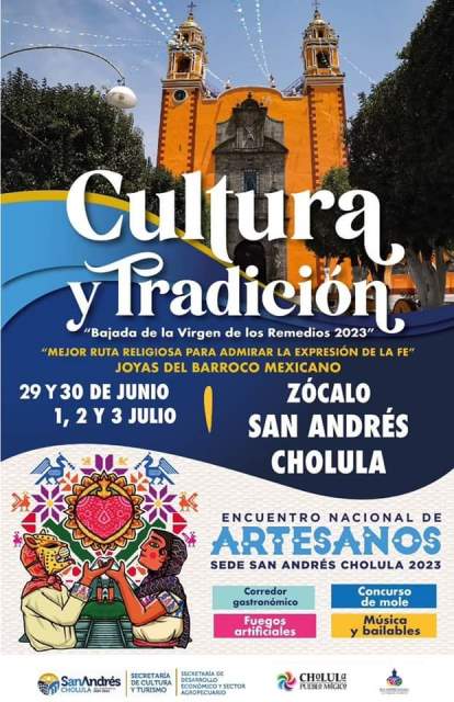 San Andrés Cholula, Puebla. – Con el propósito de difundir las tradiciones y riqueza cultural del municipio, el Ayuntamiento de San Andrés Cholula tiene todo listo para el desarrollo de la Feria Cultura y Tradición “Bajada de la Virgen de los Remedios 2023”, y el Segundo Encuentro Nacional de Artesanos, del 29 de junio al 3 de julio.