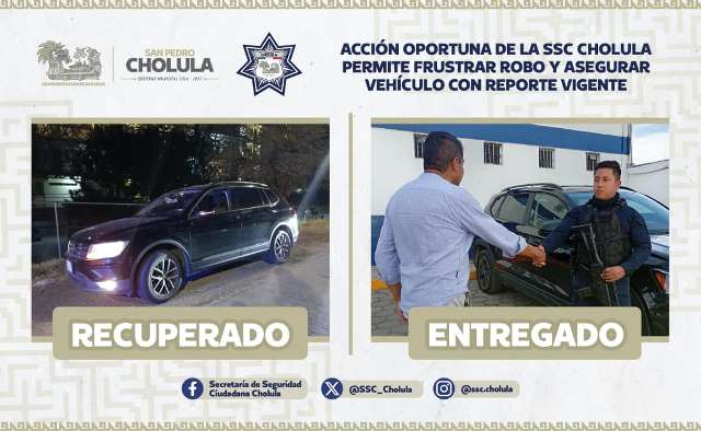 San Pedro Cholula, Pue. – Derivado de la atención inmediata a un reporte ciudadano, elementos de la Secretaría de Seguridad Ciudadana de San Pedro Cholula (SSC Cholula) frustraron el robo de una camioneta y lograron el aseguramiento de otra unidad con reporte vigente en el Registro Público Vehicular (REPUVE).