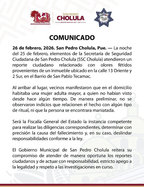 El Gobierno Municipal de San Pedro Cholula reitera su compromiso de atender de manera oportuna los reportes ciudadanos y de actuar con responsabilidad, estricto apego a la legalidad y respeto a las investigaciones en curso.