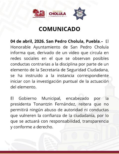 San Pedro Cholula, Pue.— El Honorable Ayuntamiento de San Pedro Cholula informó que ya inició una investigación interna tras la difusión de un video en redes sociales donde se observan posibles conductas contrarias a la disciplina por parte de un elemento de la Secretaría de Seguridad Ciudadana.