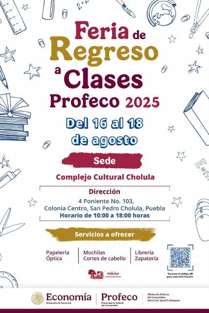 San Pedro Cholula, Pue.– Con el compromiso de apoyar la economía de las familias cholultecas y fortalecer la educación de niñas y niños, el Gobierno Municipal de San Pedro Cholula, presidido por Tonantzin Fernández, en coordinación con las secretarías de Economía y Educación del Estado y la Procuraduría Federal del Consumidor (Profeco), invita a la Feria del Regreso a Clases Profeco 2025.