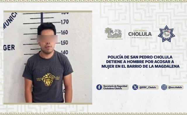 San Pedro Cholula, Pue. – Con el objetivo de proteger el derecho de las mujeres y niñas a una vida libre de violencia, elementos de la Secretaría de Seguridad Ciudadana de San Pedro Cholula (SSC Cholula) detuvieron a Jesús Pablo “N”, de 26 años de edad, por su probable responsabilidad en el delito de abuso sexual en contra de una mujer, en el Barrio de La Magdalena.