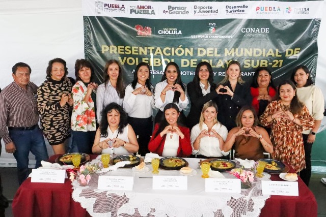San Pedro Cholula, Pue. – La presidenta municipal de San Pedro Cholula, Tonantzin Fernández, acompañada de las titulares de las secretarías de Juventud y Deporte, así como de Desarrollo Turístico, Gabriela Sánchez y Carla López-Malo, respectivamente, presentó el Mundial de Voleibol de Playa Sub 21 a restauranteros y hoteleros del municipio.