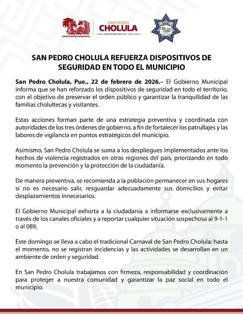 Asimismo, San Pedro Cholula se suma a los despliegues implementados ante los hechos de violencia registrados en otras regiones del país, priorizando en todo momento la prevención y la protección de la ciudadanía.
