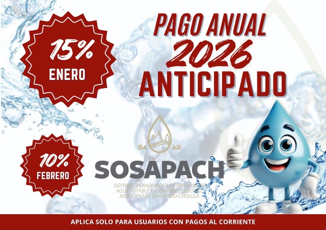 El Sistema Operador de los Servicios de Agua Potable y Alcantarillado del Municipio de San Pedro Cholula (SOSAPACH) informa a las personas usuarias sobre los beneficios vigentes por realizar el Pago Anual Anticipado 2026, conforme al esquema de recaudación anual del organismo.