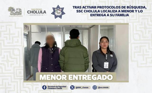 San Pedro Cholula, Pue. – Policías Municipales de la Secretaría de Seguridad Ciudadana (SSC Cholula) localizaron a un menor reportado como desaparecido, luego de activar de manera inmediata los protocolos de búsqueda en San Pedro Cholula.