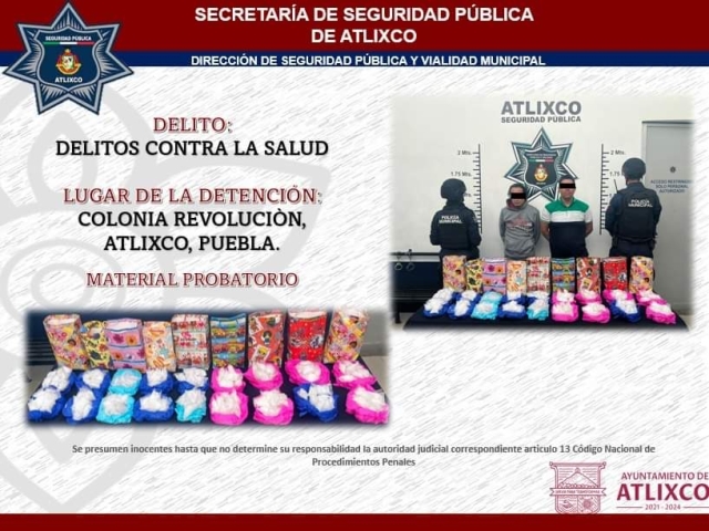 En otro recorrido de la Policía Municipal, en la Colonia Revolución, lograron la detención de dos masculinos con posesión de sustancias nocivas para la salud que portaban camuflajeadas en bolsas de regalo, dichos sujetos y pruebas, fueron presentados ante la Fiscalía General de Puebla.