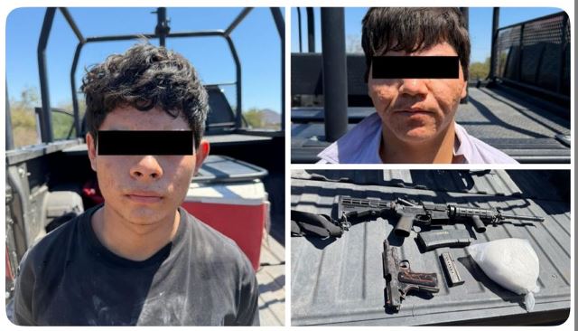 Derivado de lo anterior, se detuvo a dos hombres de 19 y 21 años de edad, a quienes se les aseguraron dosis de cristal, un arma larga, un arma corta, dos cargadores y 45 cartuchos útiles.