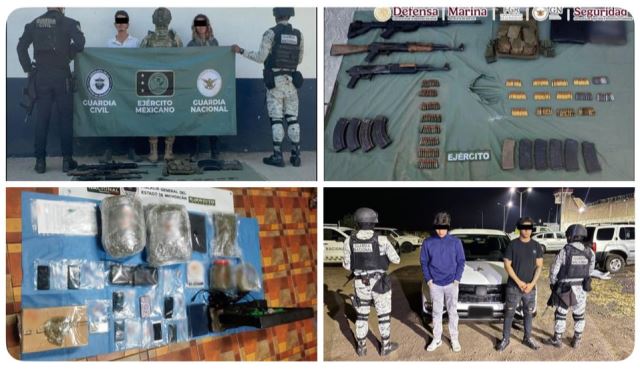 Con el fin de fortalecer las acciones del “Plan Michoacán por la Paz y la Justicia”, en diferentes eventos, elementos de la Secretaría de la Defensa Nacional (Defensa) y Guardia Nacional (GN), en coordinación con la Secretaría de Marina (Semar), Fiscalía General de la República (FGR) y Secretaría de Seguridad y Protección Ciudadana (SSPC), junto con Secretaría de Seguridad Pública (SSP) y la Fiscalía General del Estado (FGE), ambas de la entidad, se detuvo a cinco personas y se aseguraron armas de fuego y drogas en tres municipios.