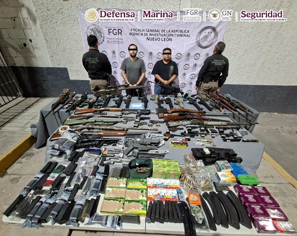 Resultado de la coordinación estratégica en Nuevo León, en una acción encabezada por elementos de la Agencia de Investigación Criminal (AIC) de la Fiscalía General de la República (FGR), junto con Secretaría de la Defensa Nacional (Defensa), Secretaría de Marina (Semar), Guardia Nacional (GN) y la Secretaría de Seguridad y Protección Ciudadana (SSPC), tras ejecutar dos órdenes de cateo se aseguró un arsenal, dinero en efectivo, tres vehículos y se detuvo a tres hombres.