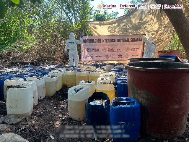 En el marco de las acciones para evitar el trasiego y elaboración de drogas sintéticas, elementos de la Secretaría de Marina (Semar) a través de la Armada de México, en coordinación con Secretaría de la Defensa Nacional (Defensa), Fiscalía General de la República (FGR), Guardia Nacional (GN) y Secretaría de Seguridad y Protección Ciudadana (SSPC), localizaron y neutralizaron seis laboratorios clandestinos empleados para la elaboración de sustancias ilícitas, y aseguraron más de cuatro toneladas de metanfetamina en el municipio de Navolato, Sinaloa.