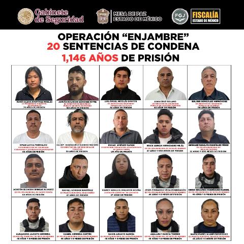Toluca, Estado de México.- Desde el arranque de la Operación “Enjambre” – estrategia coordinada para investigar y detener a servidores públicos relacionados con delitos de alto impacto, así como por su participación y colaboración con grupos criminales con presencia en el Estado de México –, hasta la fecha la Fiscalía General de Justicia del Estado de México (FGJEM) ha obtenido sentencias de condena por mil 146 años y seis meses de prisión en contra de 20 objetivos prioritarios.