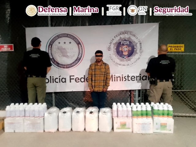 En el marco de la Estrategia Nacional de Seguridad y como parte de los trabajos de seguridad y vigilancia en carreteras nacionales, elementos de la Agencia de Investigación Criminal (AIC) de la Fiscalía General de la República (FGR), junto con la Secretaría de la Defensa Nacional (Defensa), Secretaría de Marina (Semar), Guardia Nacional (GN) y de la Secretaría de Seguridad y Protección Ciudadana (SSPC), en el estado de Sonora, detuvieron a un hombre que transportaba más de 150 litros de metanfetamina líquida oculta en envases de abono y fertilizante.