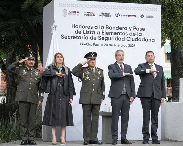 El gobernador del estado, Alejandro Armenta Mier y el alcalde, Pepe Chedraui Budib, encabezaron -en el Zócalo de Puebla- los honores a la bandera y pase de lista a fuerzas municipales de la Secretaría de Seguridad Ciudadana (SSC).