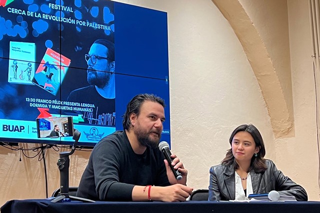 Carlos Bortoni visitó la BUAP como parte del Festival Cerca de la Revolución por Palestina, un evento literario realizado en el Marco del Día Nacional del Libro, con el objetivo de fomentar este hábito y visibilizar la situación actual que se vive en Medio Oriente, como parte de la cultura de paz promovida por la Preparatoria Emiliano Zapata.