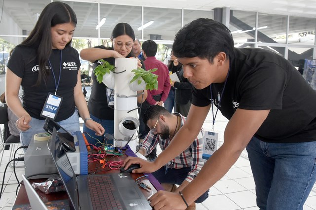 Algunos de los trabajos que se expusieron fueron “Huertos automatizados”, un proyecto de estudiantes de licenciatura y posgrado de Ciencias de la Electrónica, quienes participan en el capítulo RAS. Ellos proponen la producción de alimentos orgánicos en huertos urbanos, pero aplicando tecnología de automatización mediante control de sensores de humedad, temperatura y nivel de agua, para atender las necesidades del cultivo.