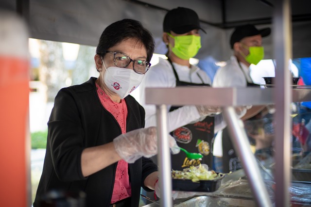 En la puesta en marcha del programa, la Rectora Lilia Cedillo Ramírez inició la distribución de alimentos a los alumnos formados en el jardín trasero de la Facultad de Ingeniería, donde estuvo acompañada del director de esta unidad académica, Ángel Cecilio Guerrero Zamora.